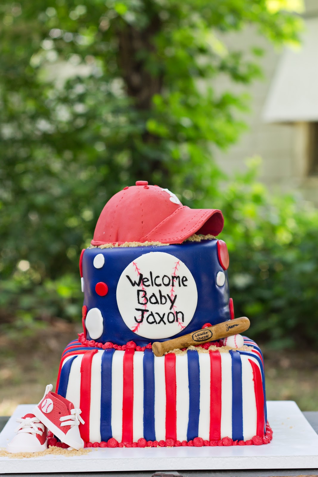 I got to make this baseball theme cake for baby Jaxon this weekend and I love love how it turned out...All they told me was red, white, and blue baseball theme and to do whatever I wanted. Yay! I was able to just go with it...so i decided to try a few things :)